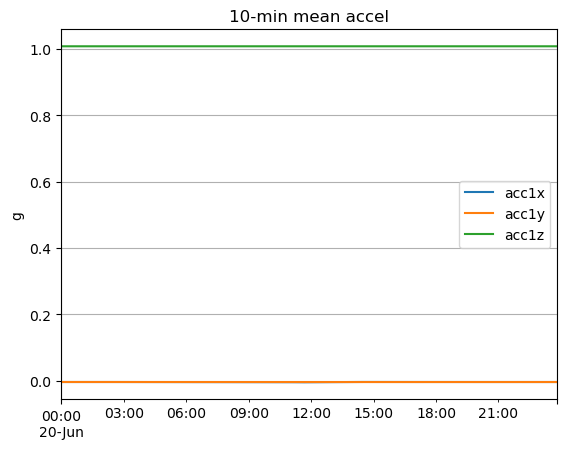 ax = minute_avg[['acc1x','acc1y','acc1z']].plot(title='10-min mean accel')