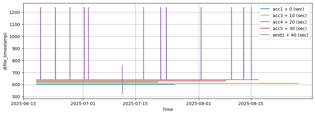 acc{i}sensors recorded continuously without apparent gaps; filename gaps were all 10 minutes.wnd1sometimes had gaps, as shown by the purple spikes in the plot above. There were two causes: 1) GPS fix failure caused new file generation to be skipped, although DAQ and saving continued in the previous filename; 2)wnd1appears to have rebooted once around 12 July. There were no further reboots.- In conclusion, data files were mostly continuous.